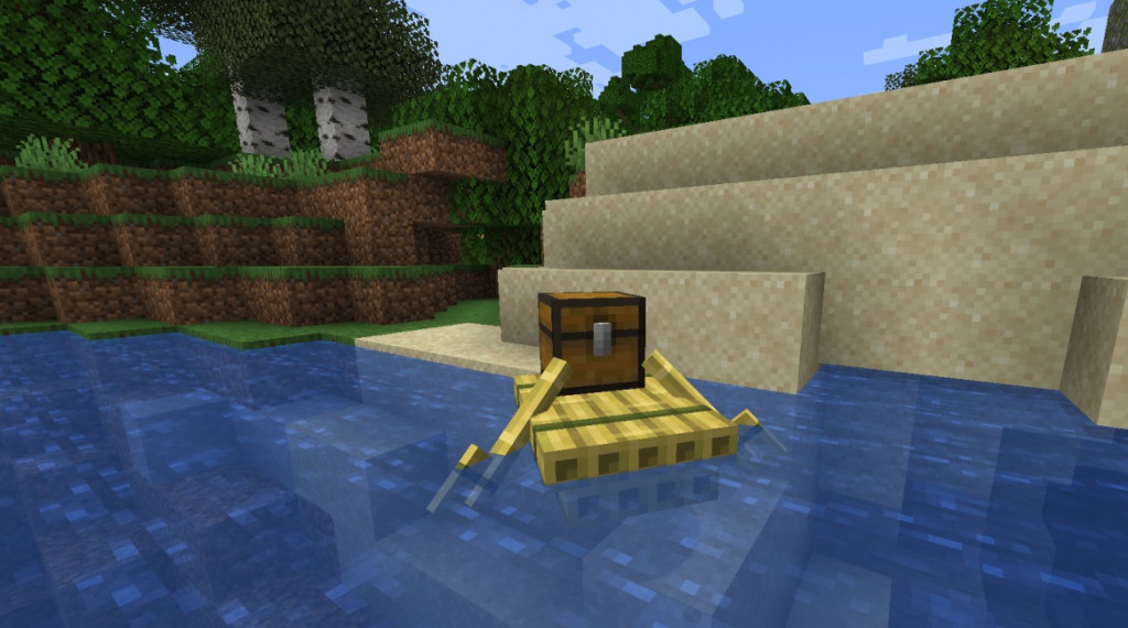Разработчики добавили в Майнкрафт новый тип лодки — бамбуковый плот. Подобное судно сооружается из бамбуковых досок. На основе обычного бамбукового плота можно создать вариацию с сундуком.