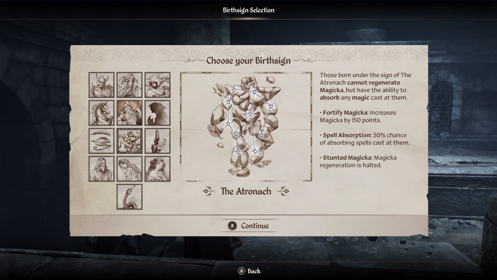 - Атронах увеличивает запас маны на 150, но отключает её регенерацию. В этом случае прокачка Алхимии становится обязательной для создания зелий восстановления маны.