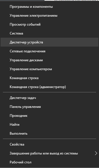 - Сделать ПКМ по кнопке «Пуск» и выбрать «Диспетчер устройств».