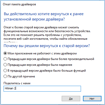 Если чёрный экран начал появляться после обновления Hitman до последней версии драйвера, следует его откатить. Также данное действие помогает пользователям, у которых установлено автоматическое обновление видеодрайверов.