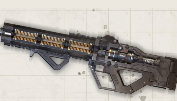 Снайперская винтовка с энергетическими боеприпасами. Характерная её черта – выстрел одновременно тремя патронами. Разброс патронов происходит по горизонтали, хотя он и небольшой. После установки дросселя точности разброс патронов сильно уменьшается. Скорострельность аналогична Длинному луку, но в сумме винтовка причиняет больше ущерба. На практике, из-за разброса, получается меньше ДМГ. В одной обойме 15 патронов, которых достаточно для 5 выстрелов.