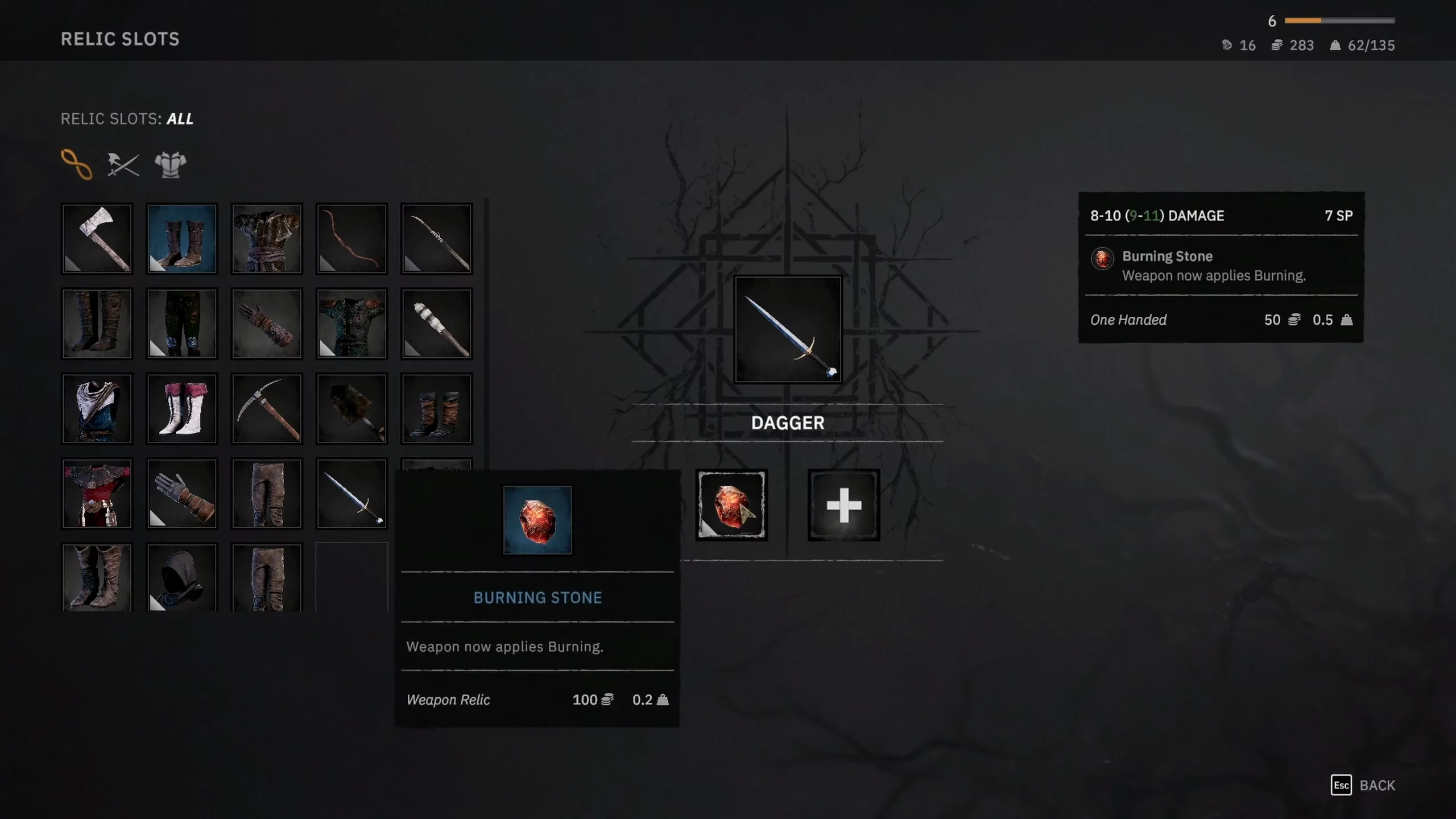 У оружия и брони есть особые слоты, куда игрок может вставлять реликвии, заручившись помощью Точильного камня (или просто Точила). Некоторые предметы экипировки не обладают слотами, но их можно добавить вручную тем же Точилом, но только за определенную плату.
