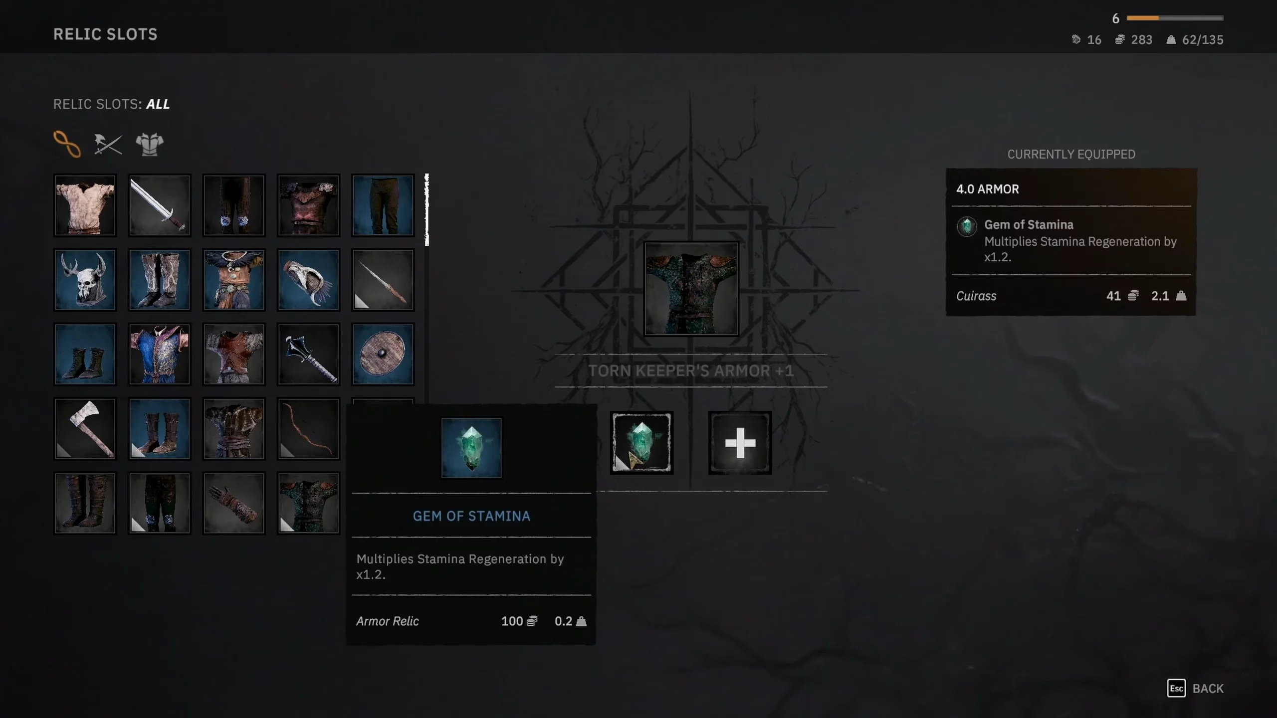 Через реликвии можно улучшать разнообразное оружие (независимо от вида), а также каждую часть доспехов в отдельности. На бижутерии (кольца, амулеты) и заклинаниях реликвии задействовать, к сожалению, нельзя.