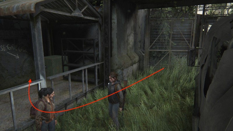 Получив код от сейфа, идите в другой конец комнаты и уберите со своего пути коробку. Пригнитесь и ползите до тех пор, пока не окажетесь в огороженной решеткой территории, которая находится справа от ворот.