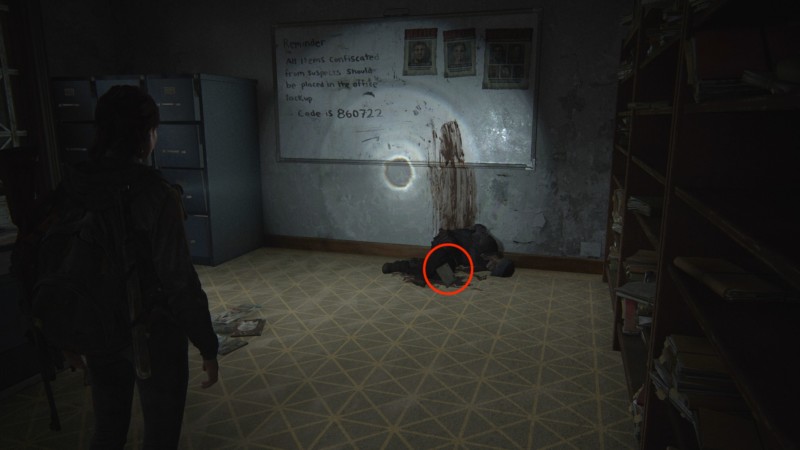 В главе Пешая прогулка, после нападения Шрамов в предыдущей секции игры, вы пройдете через склад, сад и парковку с трейлером посередине. Внутри трейлера ищите шкафчик с выдвижными ящиками, который стоит перед кофеваркой. Подберите артефакт «WLF Gun Cache Note», в котором будет присутствовать намек на комбинацию для сейфа (да, не сами цифры, а просто намек).