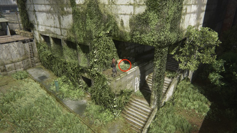 Поднимитесь по обросшим мхом и другой зеленью ступенькам и развернитесь на самом верху. Обыщите рюкзак рядом с зеленым ящиком, чтобы найти артефакт «WLF Community Supply Chest Note».