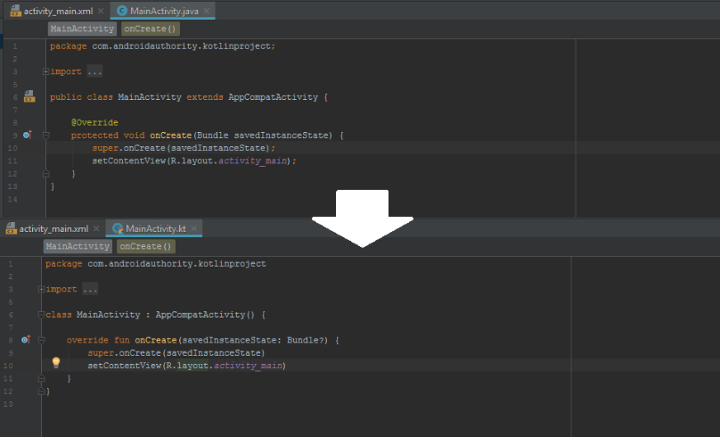 Роль подобного кода – сообщить Android о том, где расположен связанный файл макета. В Kotlin и Java они несколько отличаются. Это значит, что внешний вид действия для добавления кнопок, текста, окна и т. п. будет отличаться. Файл расположен по пути MyApplication> app> src> res> layout и называется activity_main.xml.