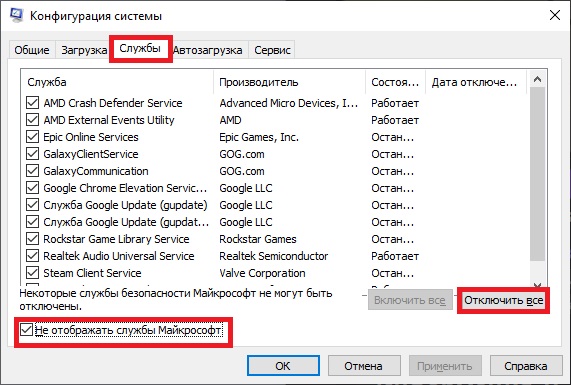 - переключитесь на вкладку «Службы», после чего поставьте галочку возле опции «Не отображать службы Майкрософт» и нажмите на кнопку «Отключить все»;