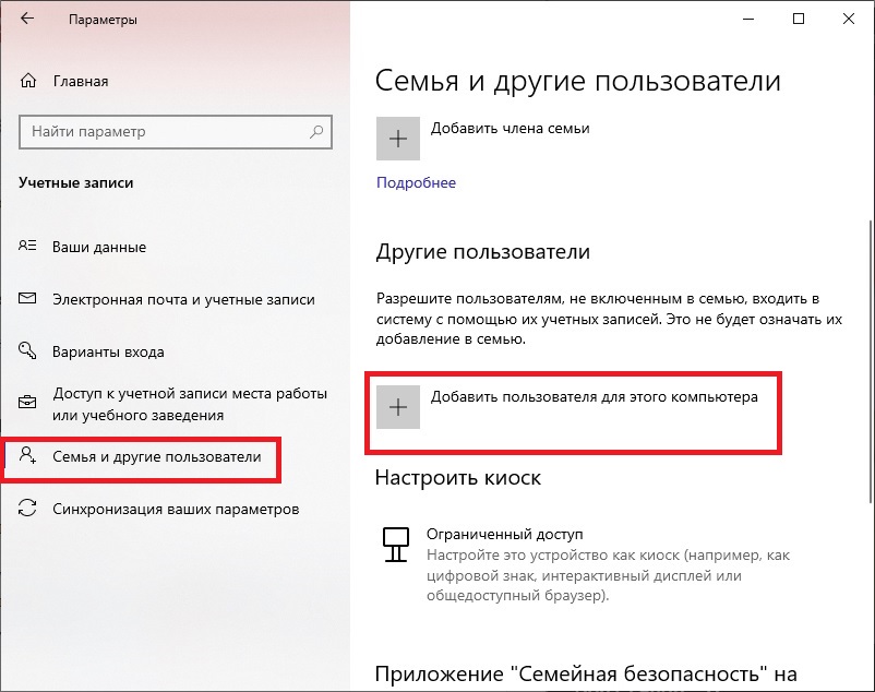 - перейдите в раздел «Учетные записи», далее — в подраздел «Семья и другие пользователи»;
