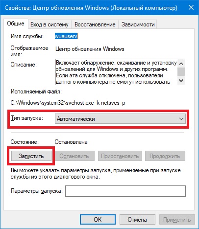 - В типе запуска службы выставьте «Автоматически» и кликните на кнопку «Запустить».