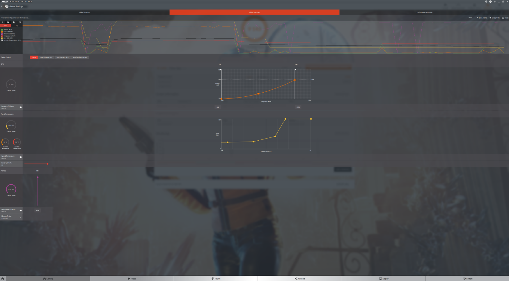 Сегодня MSI Afterburner не имеет должной поддержки новой видеокарты (скоро должна появиться). При этом функциональности WattMan драйверов Radeon Adrenalin вполне достаточно для разгона. Для достижения максимальной производительности я изначально повысил скорость вращения кулера. Это действие приводит к повышению шума, ведь изначально кулера работают на 75% от максимальной скорости. Дальше я повысил уровень питания на 20%. Только напоследок перешёл к увеличению тактовой частоты ГПУ и памяти HBM2.
