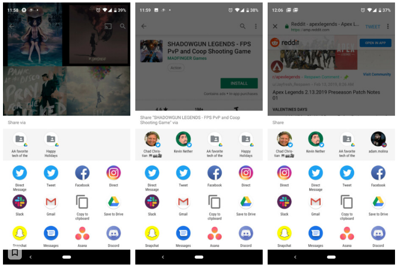 Также хотелось бы увидеть стандартный вид и положение кнопки «Поделиться». Обычно это выглядит в качестве треугольника с тремя точками, но бывают и другие варианты кнопки: текстовое сообщение, стрелка, значок с текстом. Кнопка «Поделиться» может появляться то сверху, то снизу, то по центру экрана или вовсе находится внутри меню из трёх точек. Пара примеров на скрине. Чтобы использовать кнопки проще, нужно привести всё к общему знаменателю. В таком случае даже пользователь с минимальным опытом без труда разберётся в экосистеме Android.