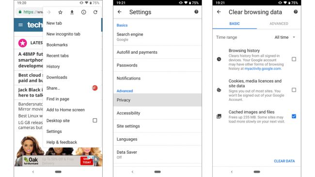 Используя Chrome на iOS или Android, откройте его и зайдите в настройки приложения. Прокрутите вниз и нажмите строку «Конфиденциальность». Затем нажмите «Очистить историю». Здесь вы можете выбрать какие типы данных просмотра вы хотите очистить. Два верхних пункта стирают историю посещенных страниц и сохраненные пароли – но вы, вероятно, не захотите выбирать этот пункт. Убедитесь, что вы выбрали «Кэшированные изображения и файлы» — и нажмите «Очистить данные».